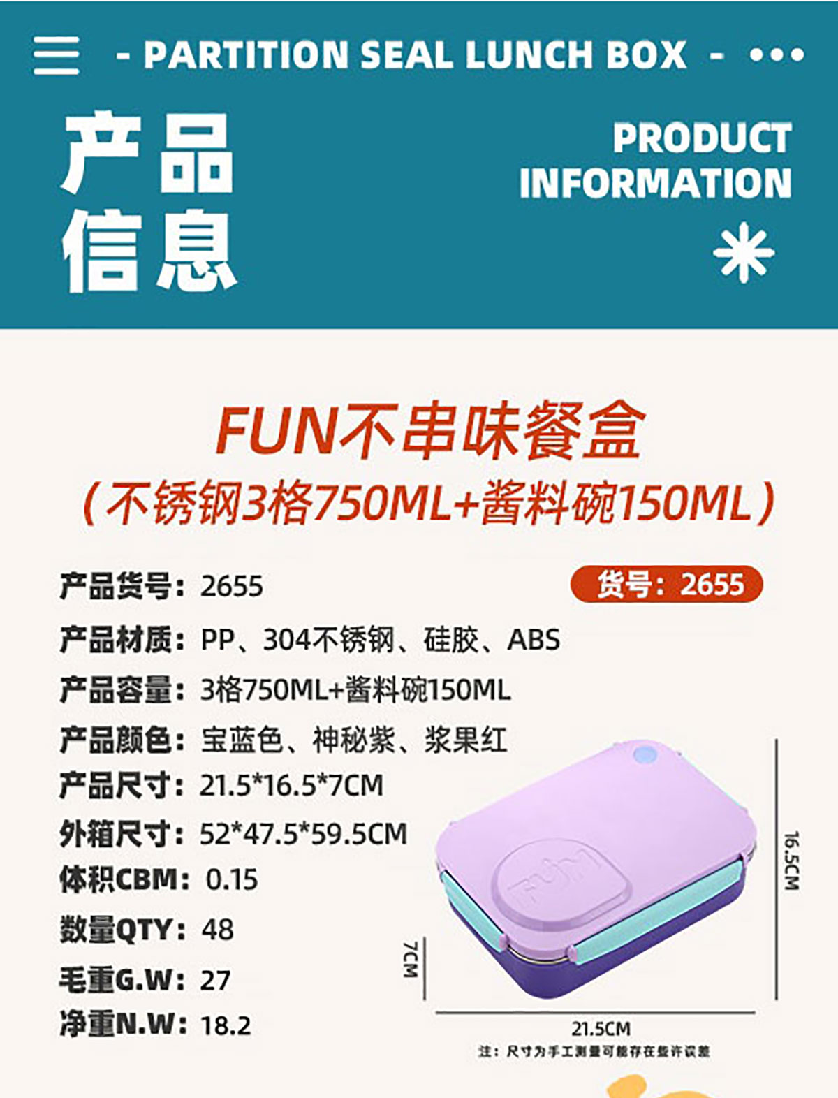 Size: AQX-2655:215*165*70mm/+塑料碗150ml AQX-2656:215*165*70mm/+不銹鋼碗150ml