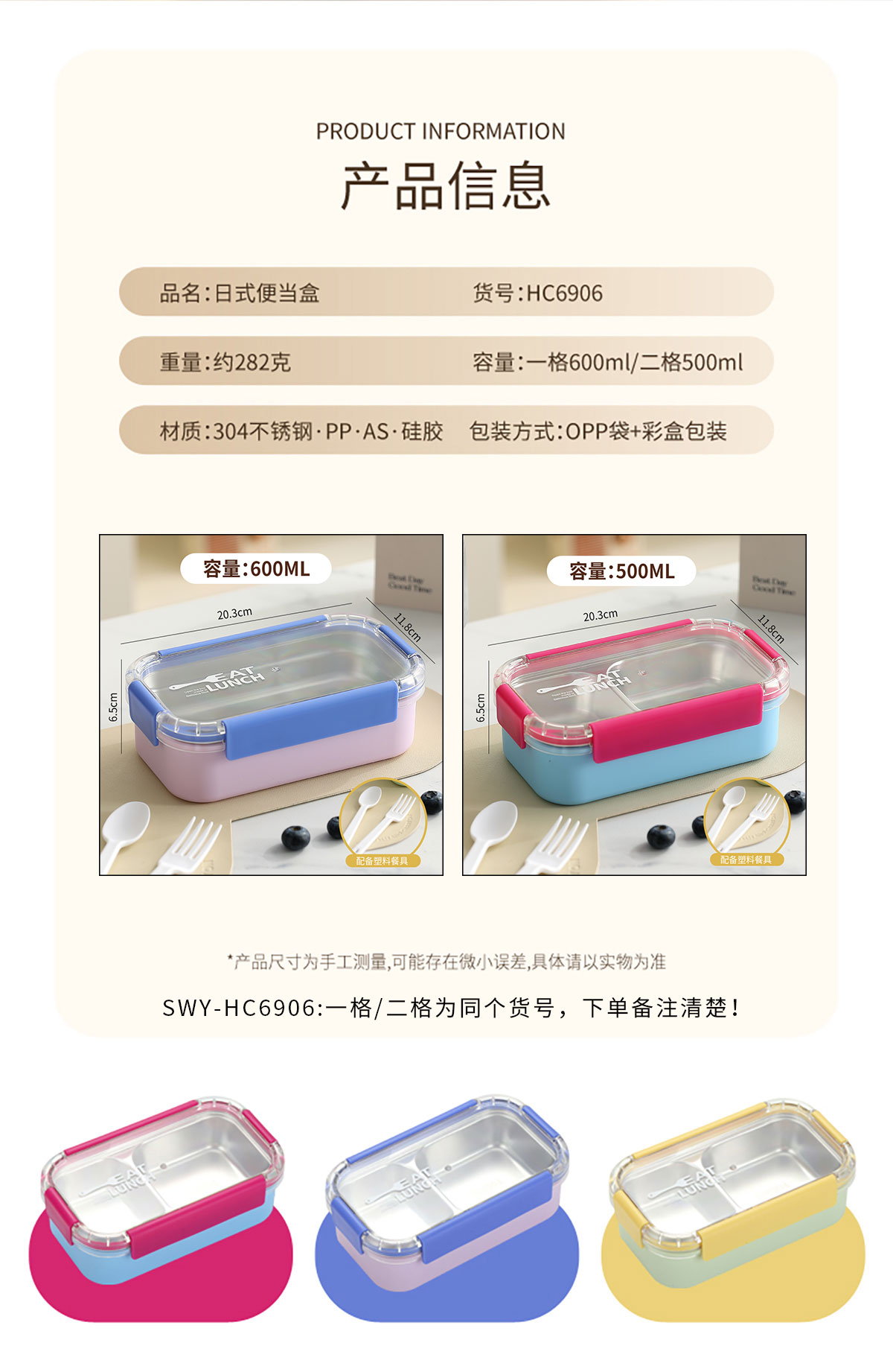 Size: 一格:203*118*65mm/600ml 二格:203*118*65mm/500ml